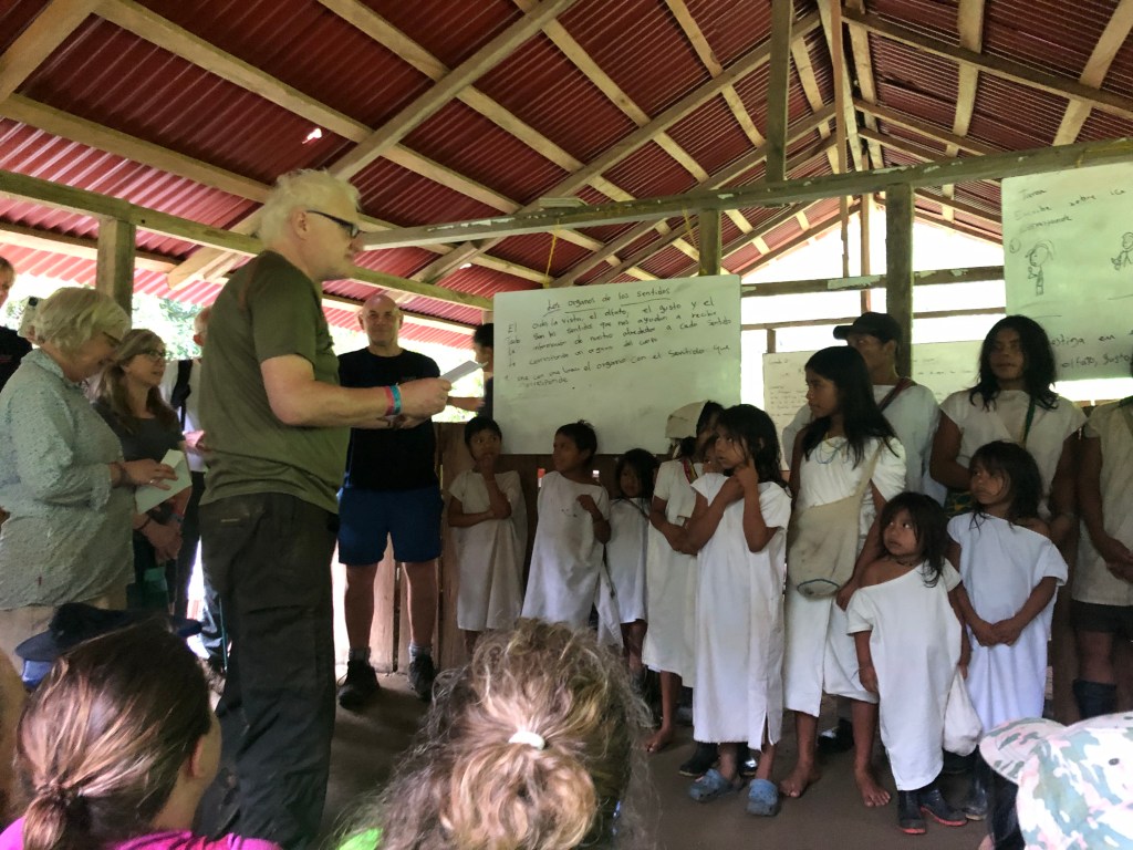5 am rise. Start jungle path alongside river. Hand gifts over to indigenous Kogui schoolchildren. Peter speaks on our behalf in Spanish.