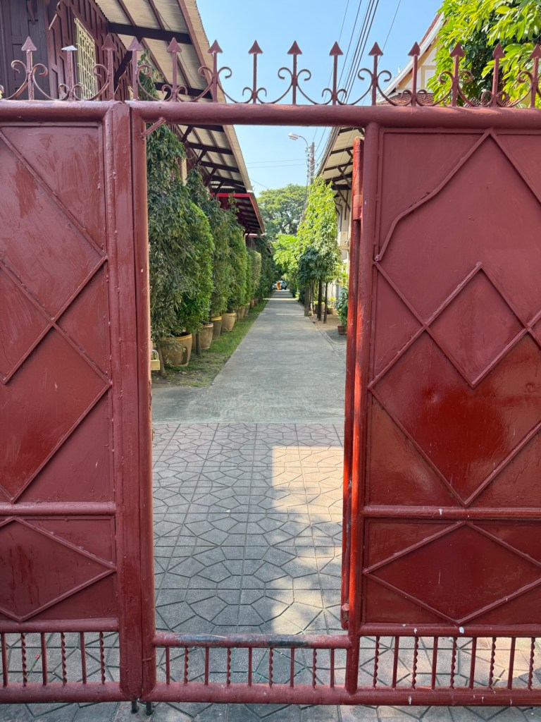 From there we took a long walk, starting at the riverside by our hotel. We went through the Thammasat university to catch a local ferry across the Chai Phraya. We wandered through a less touristy market to the quiet Wat Rakhang. We then found a route through narrow alleyways of traditional homes with corrugated iron fences and rails of drying washing.