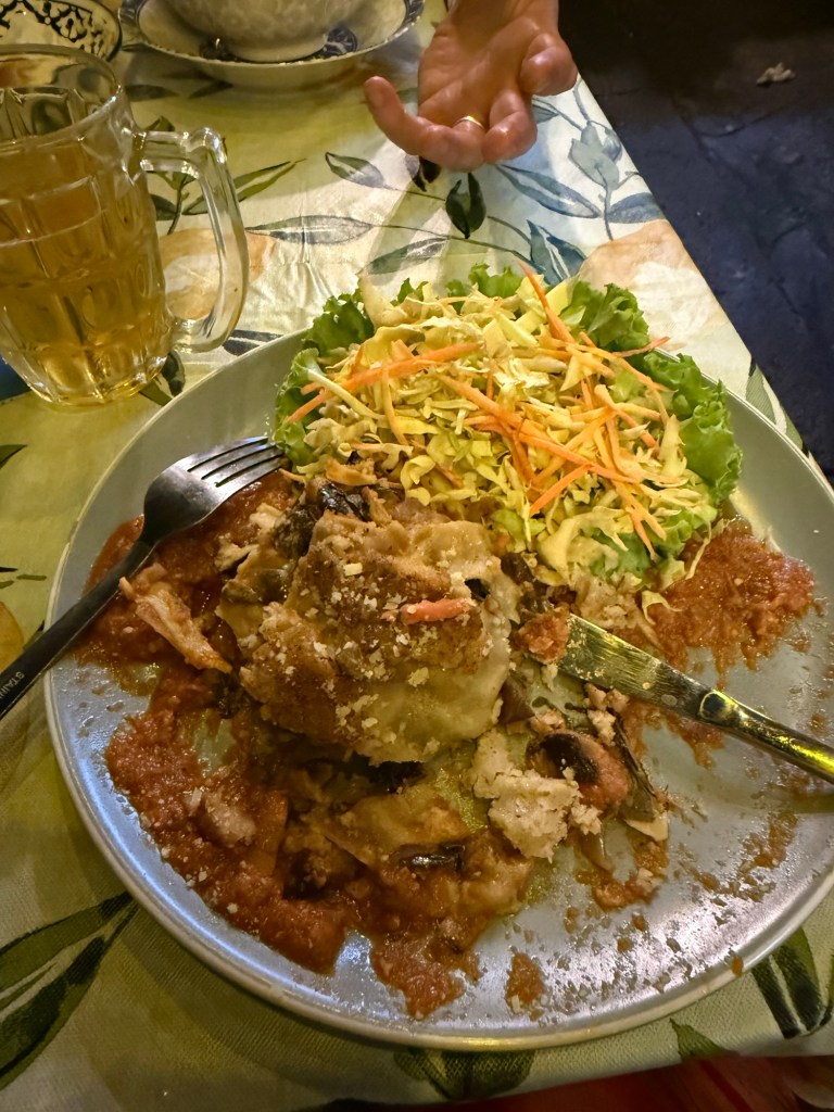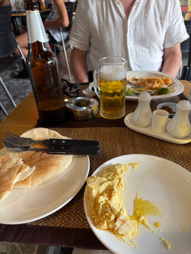 We caught the tourist hop on hop off boat back to Phra Athit, disembarked and dined at Casa Picasso. Over shrimp pad Thai (Peter) and humus (me) we people watched in comfort with two large Singhas.