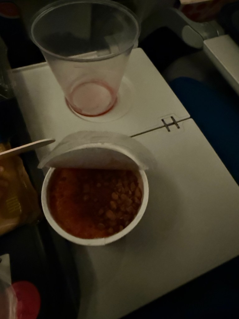 Squished but slept intermittently arriving slightly ahead of time at 1545.